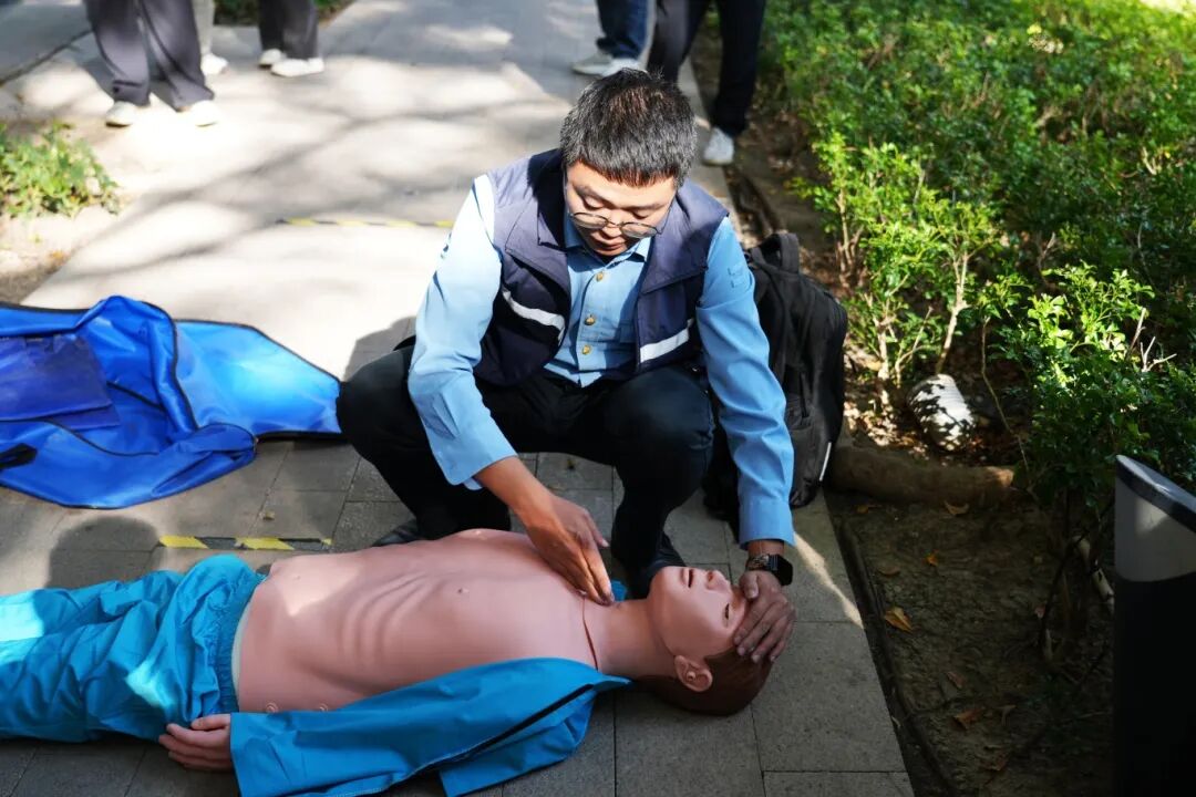 在急救技能演练环节,黄教员利用人体模型,详细演示心肺复苏全流程,包括意识判断、呼救、胸外按压、开放气道与人工呼吸等步骤。参训员工认真观摩、积极互动,基本掌握了现场急救技能。